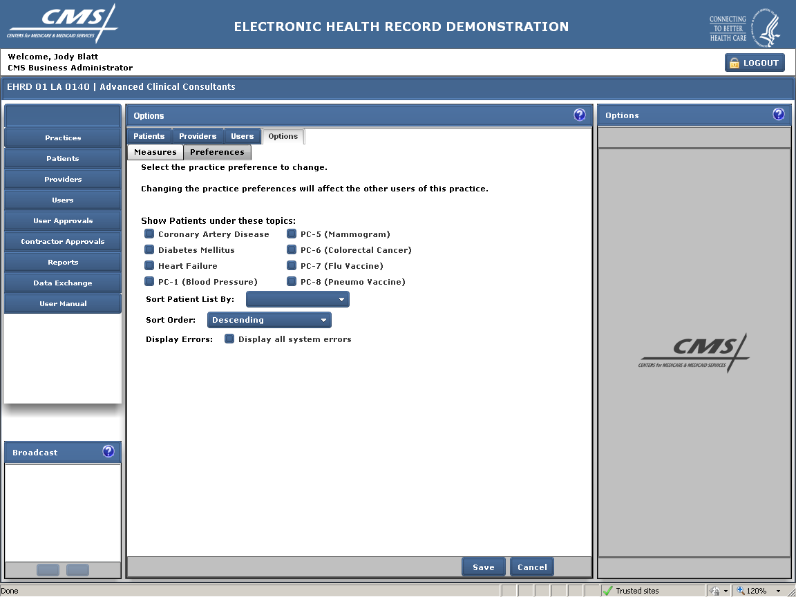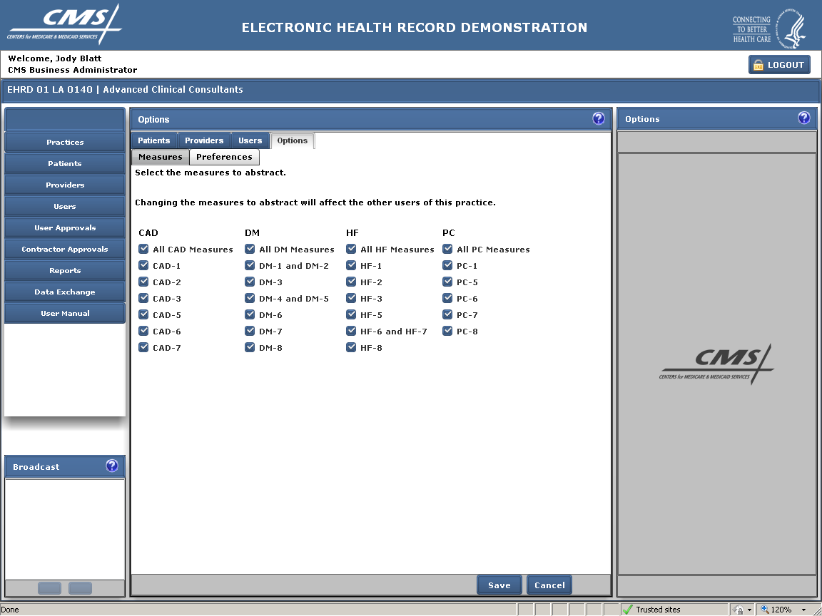 The Options Tab includes the “Preferences” and “Measures” tabs shown on the next two pages. These pages are only available to CMS (and its contractors) and the Practice Lead/Administrator. These screens allow the practice to set the defaults for reporting in terms of which measures will be reported, how they will be sorted, etc. For practices importing data from a tab delimited file created from data in an EHR or registry, the measures tab may be used to indicate what data should be abstracted. Because the options selected can affect all other users affiliated with this practice, access to this screen is limited.