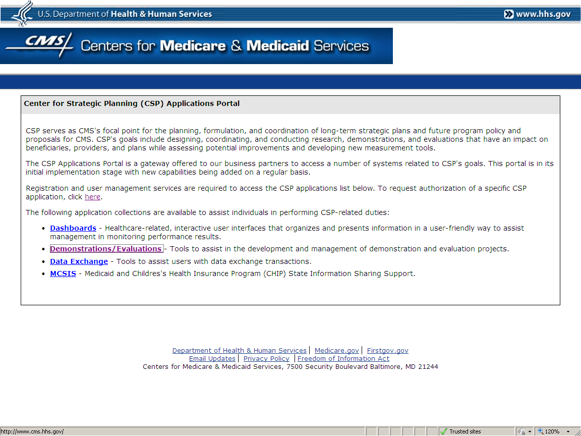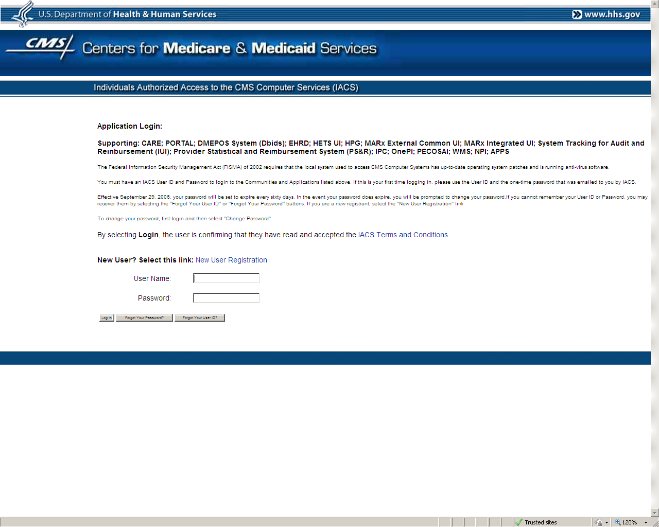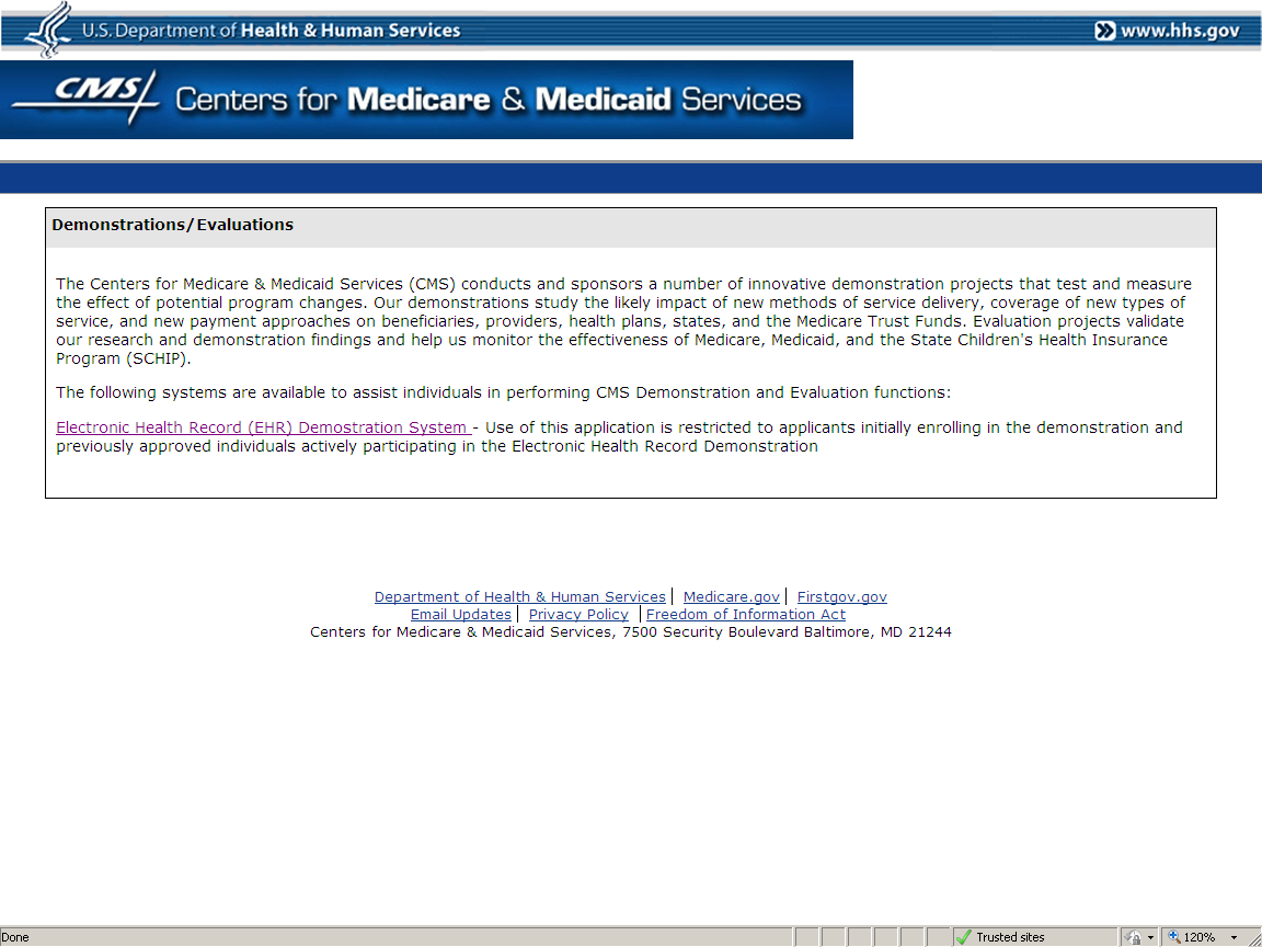 The EHR Demo user first logs in through the CMS “IACS” (Individuals Authorized Access to the CMS Computer Services) portal. All users must first get an IACS user name and password before accessing any of the functions or applications housed in this secure CMS web environment.