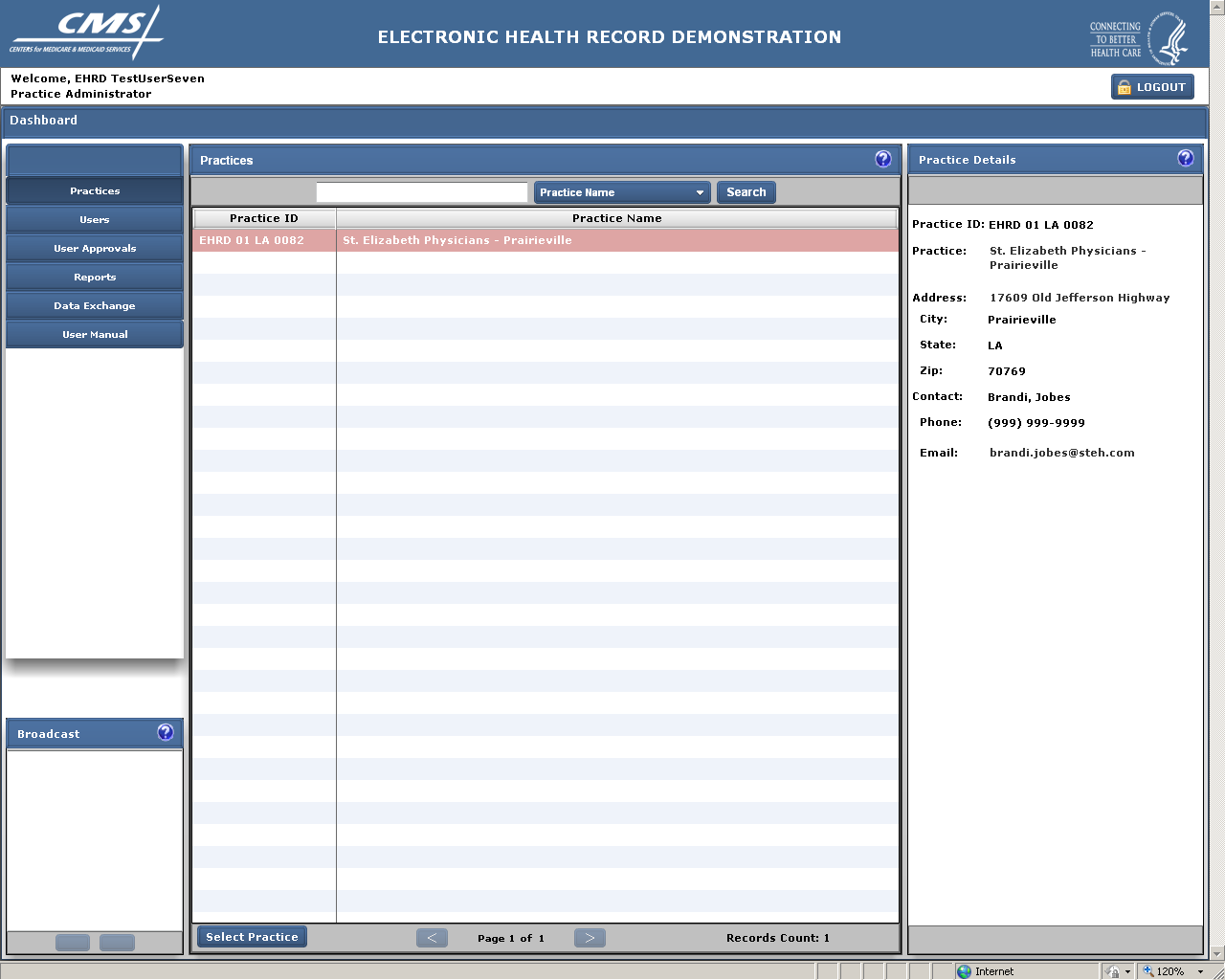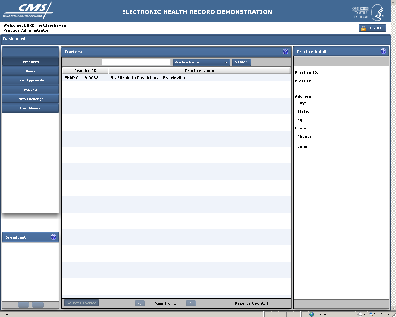 When the user first enters this module, the list of practices associated with the user comes up. In most cases, a user will only be associated with one or perhaps a few practices. The ability to view practices is limited by security during the initial logging on process.