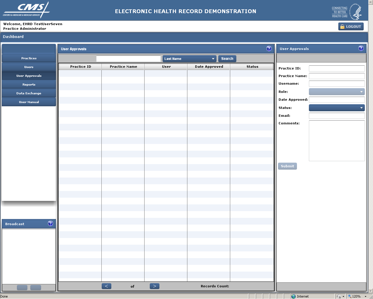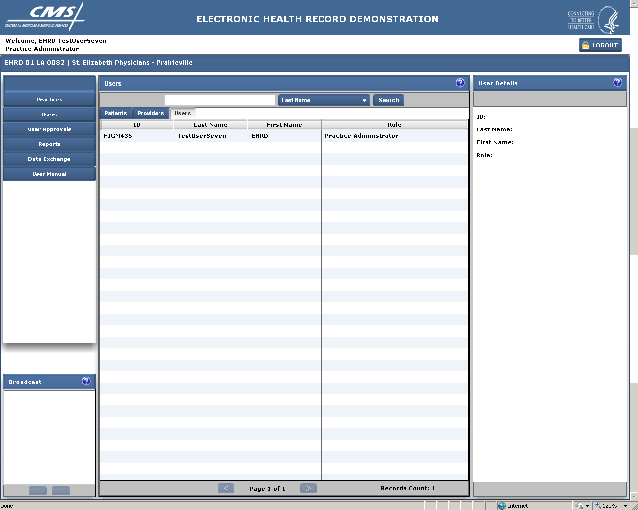 This screen shows the users who are authorized to view and/or enter data for this practice. Access in the EHRDS system is role based and controlled by the designated lead person for the practice who, with the exception of the CMS-designated system administrators, is the only person allowed to authorize access for the practice. New users at the practice must request to “join” the practice and be approved for specific functions by the practice administrator/lead. While it is not anticipated that a given practice will have a large number of users, if there are, the arrow buttons at the bottom of the center column can be used to go to additional pages.