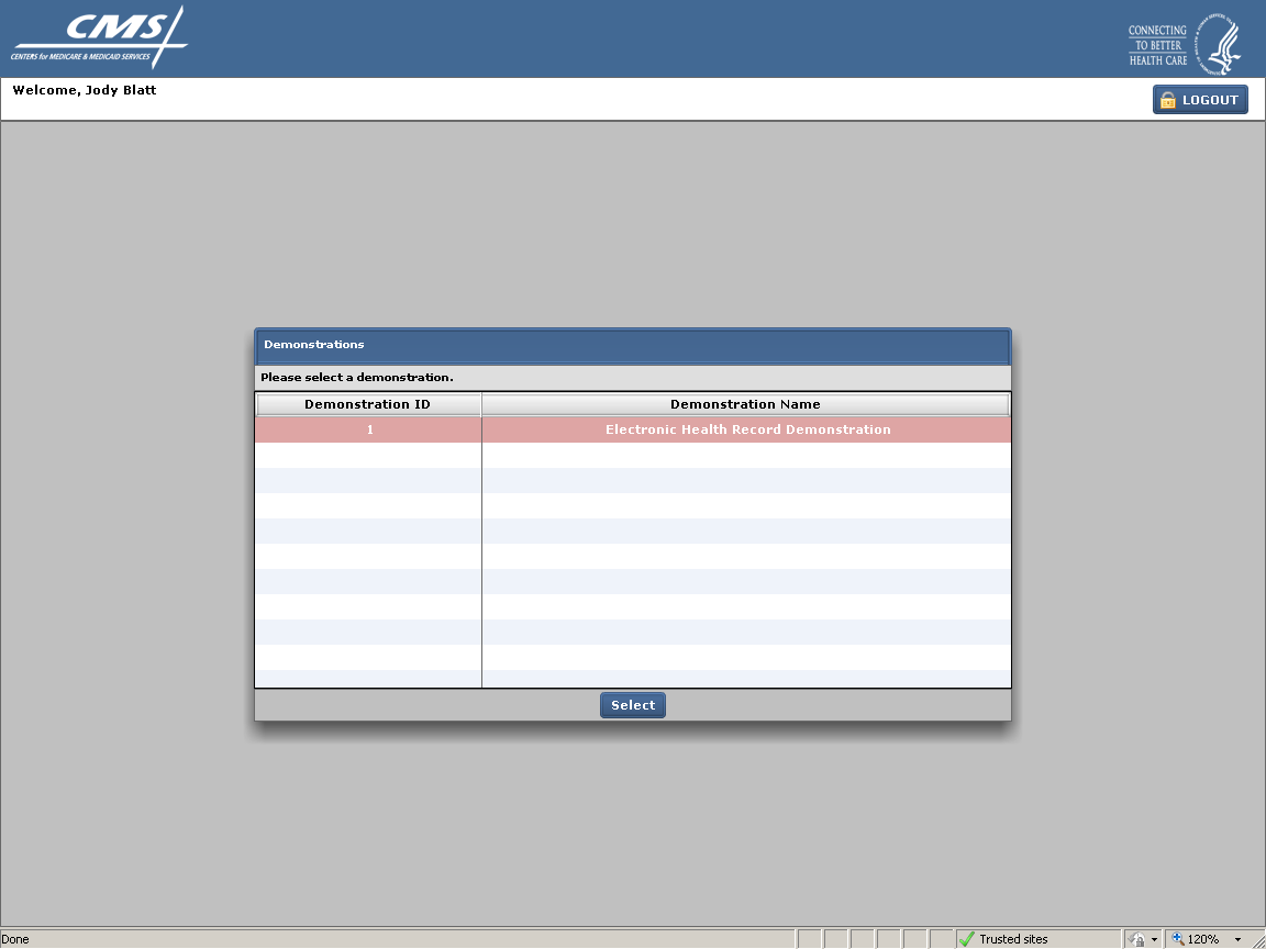 The user then clicks on the selected demonstration. The EHR Demonstration System will be the first demonstration system to be implemented. In the future, there will be other demonstrations with web applications listed.