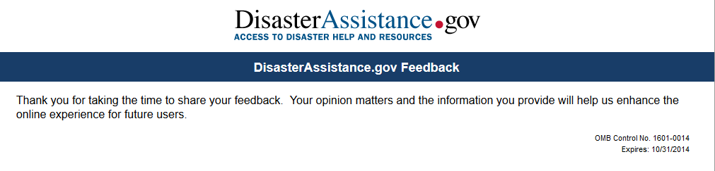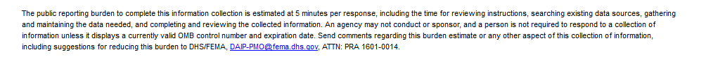 Public reporting burden for this survey is estimated to take 10 minutes per response. The burden estimate includes the time for reviewing instructions, searching existing data sources, gathering and maintaining the data needed, and completing and submitting the survey. This collection of information is voluntary. You are not required to respond to this collection of information unless it displays a valid OMB control number displayed in the upper right corner of this form. Send comments regarding accuracy of the burden estimate and any suggestions for reducing the burden to: Information Collections Management, Department of Homeland Security, Federal Emergency Management Agency, 500 C Street, SW Washington DC 20472-3100, Paperwork Reduction Project (1660-0130). NOTE: Do not send your completed form to the above address.