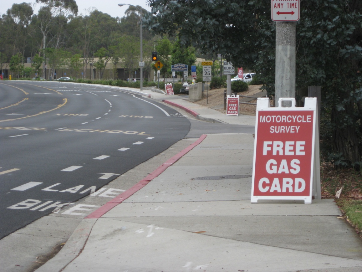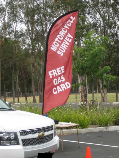 The signage used to identify the location of control rider interview site was improved. Conversations with the crash investigators from the Pilot Study revealed that only having one sign to announce the data collection site did not give possible control riders enough time to make a decision about participating or change lanes. Therefore, two more sandwich-board signs were purchased along with vertical banners. The sandwich-board signs are to be placed far enough ahead of the data collection location to allow the riders to consider whether or not they would like to participate and allow for enough time and distance to change lanes if necessary. The vertical banners will be used to identify the location of the control data collection site. Additionally, the investigators will display their own motorcycles at the interview location when possible.
