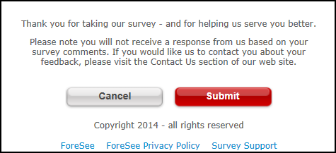 | Thank you for visiting NOAA Fisheries. You have been randomly selected to take part in this survey that is being conducted by ForeSee on behalf of NOAA Fisheries. Please take a few minutes to give us your feedback. All results are strictly confidential. | Thank you for taking our survey - and for helping us serve you better. Please note you will not receive a response from us based on your survey comments. If you would like us to contact you about your feedback, please visit the Contact Us section of our web site. |