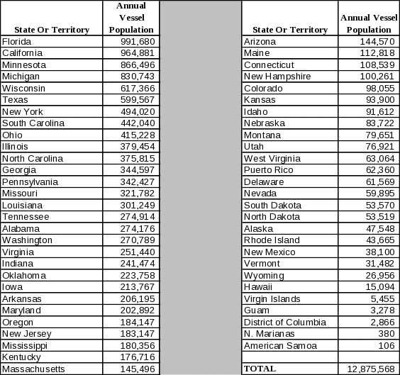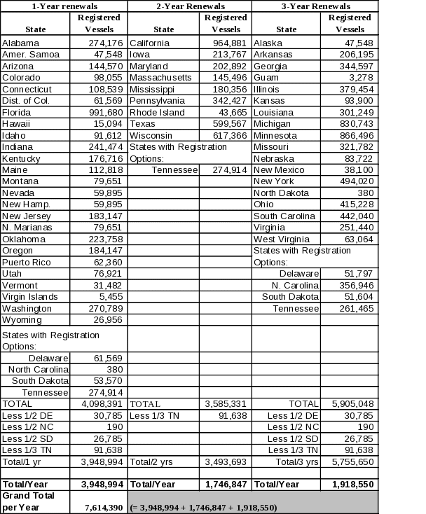 The registration cycles of States vary. For example, whereas Florida requires registration to be renewed every year, California requires registration to be renewed every two years, and Minnesota every three years. Tennessee renews registrations every one, two and three years. From the number of registered vessels and the renewal cycles, we estimate that there were approximately 7,614,390 changes in registration (new registrations and renewals) in 2007. See Table 3.