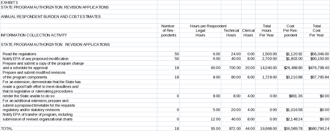 Exhibit 3 presents the estimated respondent burden hours and costs incurred during the revision stage of State authorization programs. EPA expects that a total of 18 approved States will submit one program revision annually over the next three years. This assumption is based on the current trend.