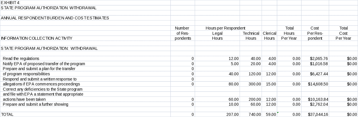 Exhibit 4 presents the estimated annual respondent burden hours and costs incurred for the withdrawal of State programs. EPA expects that there will be no program withdrawals over the next three years. There are therefore no respondent burden hours or costs associated with this activity.