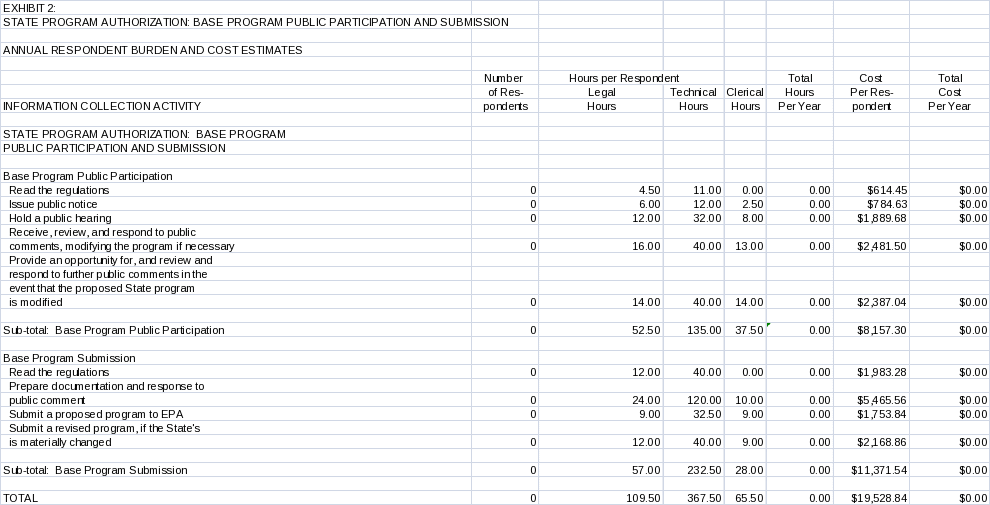 Exhibit 2 presents the estimated annual respondent burden hours and costs incurred during the public participation and submission stage of State authorization programs. EPA expects that there will be no base program developments over the next three years. Therefore, there are no respondent burden hours or cost associated with this activity.