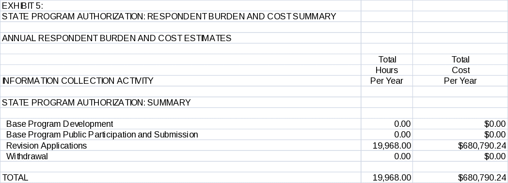EPA estimates annual Agency burden hours and costs associated with all of the requirements covered in this ICR in Exhibit 6. Exhibit 6 presents the four specific stages of the State authorization process -- Base Program Development, Base Program Public Participation and Submission, Revision Applications, and Withdrawal -- and associated respondent burden hours and costs required to conduct information collection activities over the next three years.