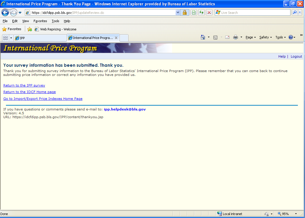 Paperwork Reduction Act Statement. We estimate that completing each form will take an average of 5 minutes (varying from 1 to 30 minutes). This estimate takes into account time for reviewing instructions, searching existing data sources, gathering and maintaining the necessary data and completing and reviewing the information. If you have any comments regarding this voluntary survey, including suggestions for reducing the burden, send them to the Bureau of Labor Statistics, Division of International Prices, 1220-0025, 2 Mass Ave NE, Washington, D.C. 20212. Without a currently valid OMB number BLS would not be able to conduct this survey. |
