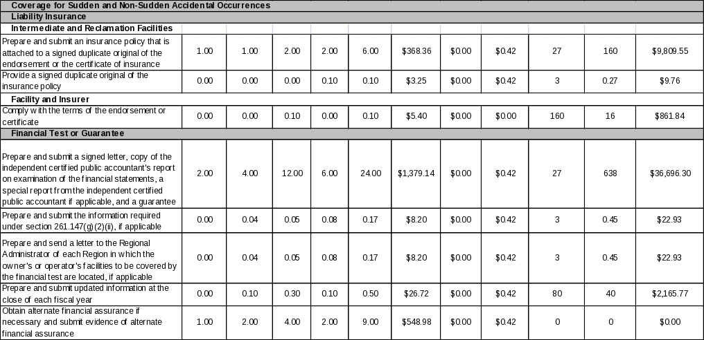 EPA estimates that 20 percent of the facilities will establish liability insurance for sudden accidental occurrences and, if applicable, nonsudden accidental occurrences (399 x 20% = 80). These facilities must submit the required information to establish the instruments. Because this is a one-time activity, EPA has annualized the number of facilities over the three-year life of this ICR, to estimate that 27 will submit the information annually. EPA estimates that 10 percent of the facilities using this instrument will submit a signed duplicate original of the insurance policy.