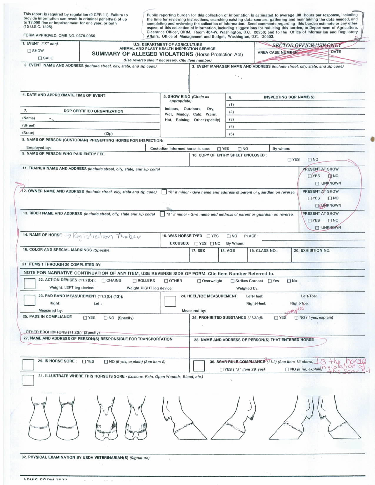 This report is required by regulation 9 CFR 11). Failure to provide information can result in criminal penalty(s) of up to $3,000 fine or imprisonment for one year or both (15 U.S.C. 1825). |