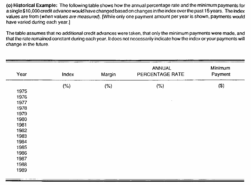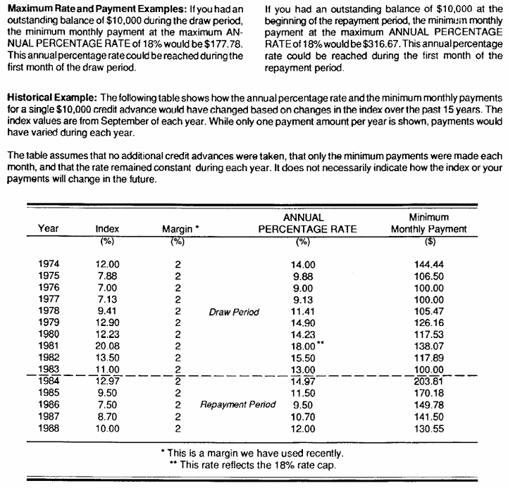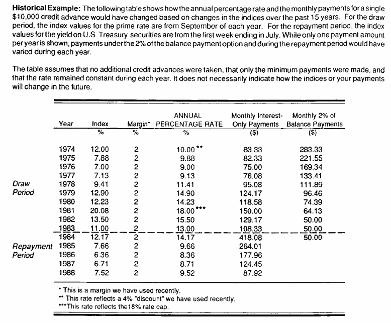 The example below shows how your payments would have changed under this ARM program based on actual changes in the index from 1982 to 1996. This does not necessarily indicate how your index will change in the future. The example is based on the following assumptions: