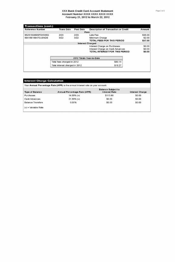 We figure [a portion of] the finance charge on your account by applying the periodic rate to the “average daily balance” of your account (including current transactions). To get the “average daily balance” we take the beginning balance of your account each day, add any new [purchases/advances/loans], and subtract any payments or credits, [and unpaid finance charges]. This gives us the daily balance. Then, we add up all the daily balances for the billing cycle and divide the total by the number of days in the billing cycle. This gives us the “average daily balance.”
