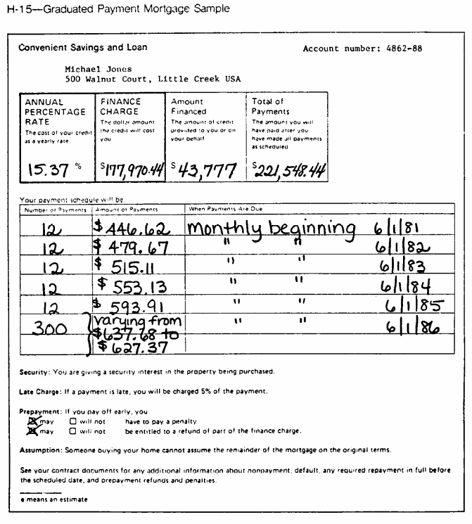 • [For example, on a $10,000, 30-year loan with an initial interest rate of 12.41 percent in effect in July 1996, the maximum amount that the interest rate can rise under this program is 5 percentage points, to 17.41 percent, and the monthly payment can rise from a first-year payment of $106.03 to a maximum of $145.34 in the fourth year. To see what your payment is, divide your mortgage amount by $10,000; then multiply the monthly payment by that amount. (For example, the monthly payment for a mortgage amount of $60,000 would be: $60,000÷$10,000=6; 6×106.03=$636.18 per month.)