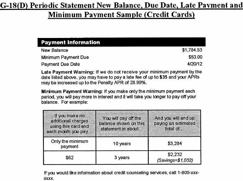 G-18(D) Periodic Statement New Balance, Due Date, Late Payment and Minimum Payment Sample (Credit cards) (§ 1026.7(b))