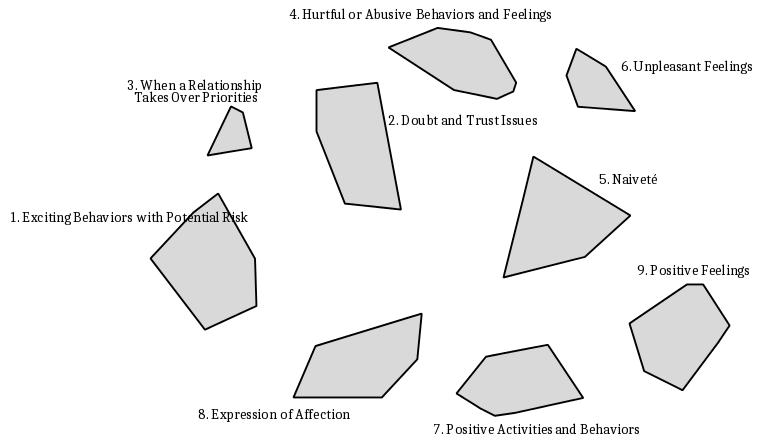 Facilitated discussions with teen participants also illuminated specific statements and clusters, particularly those located toward the center of the map, that could be perceived as healthy or unhealthy depending on the specific context or circumstances in which they occur. Discussion with project Advisory Group members suggested that this ambiguity or continuum along which teens might consider a certain idea as healthy/unhealthy or desirable/undesirable may be reflective of their stage of development or level of experience with dating relationships. Subsequent information collection that includes a wider age range of respondents is necessary to better understand whether such ambiguity or context dependency exists among teens and young adults, or whether it is more likely a factor of teens’ developmental stage.