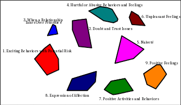 Each stage of the process will allow for such comparison. As a result of brainstorming activity, the research team will be able to compare the statements generated by youth and adults, and develop a single set of ideas for sorting and rating that represent a synthesis of both respondent groups’ ideas. As a result of the sorting activity, the research team will be able to compare the emergent frameworks and determine a) to what extent, if at all, the dimensions that emerged in the pilot framework are reproduced and/or b) specific areas of convergence and divergence in how youth and adults conceptualize teen dating relationships. The process will allow the research team to compare cluster solutions among both groups to reveal any tendencies in how youth and adults categorize features of dating relationships. For example, do adults and teens differ in the number of piles into which they sort ideas, thereby suggesting that one group may conceptualize the topic more specifically or distinctively than the other? As a result of the ratings activity, the research team will be able to compare the extent to which youth and adults (and subgroups of both populations) perceive the relative frequency and desirability of the ideas. This comparison will be instrumental in illuminating any areas of disagreement between how teens and adults working in the field perceive what occurs in dating relationships. Finally, the facilitated discussions will enrich the conceptual framework even further by allowing groups of youth and adults in various geographic locations to comment on their interpretation of the map and its potential utility.