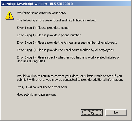 The error message window in the PDF form was modified to put the instructions for how to proceed at the bottom of the window so users could read it immediately before deciding to click “Yes” or “No”.
