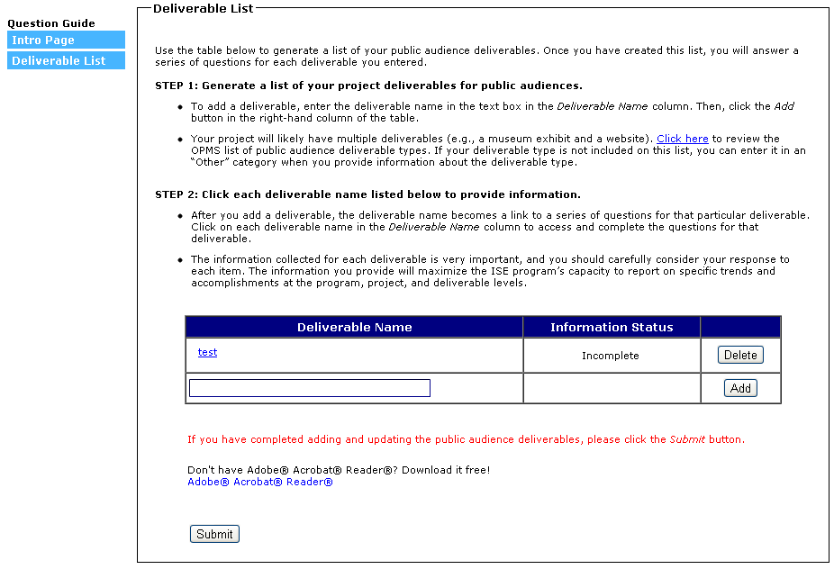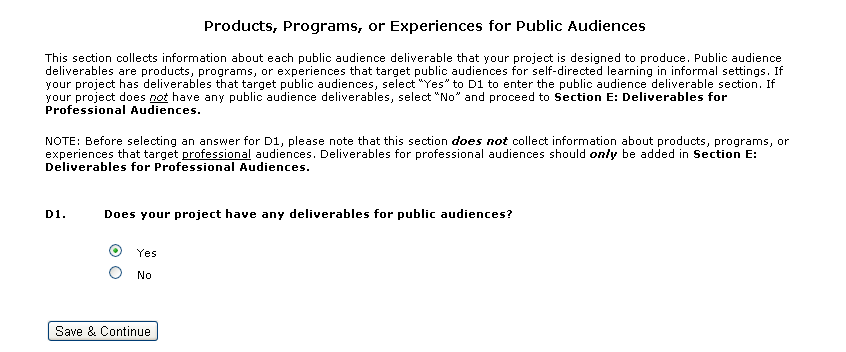 (Only projects that select “Yes” to D1 will continue to the Deliverable List screen)