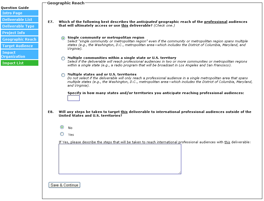(Only projects that select “Yes” to E1 will continue to the Deliverable list screen)