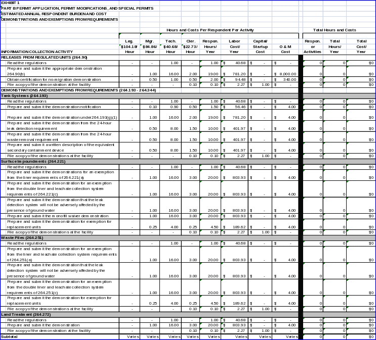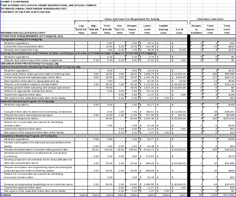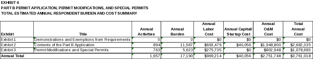 In complying with Part 270 requirements, facilities may incur operations and maintenance (O&M) costs associated with some respondent activities. O&M costs include mail submittals, purchased materials costs, and certain lump-sum purchased service costs. Exhibits 1 through 3 detail these costs, if any, for each discrete information collection activity. Exhibit 4 provides the annual bottom-line respondent O&M cost associated with all information collection requirements included in this ICR.