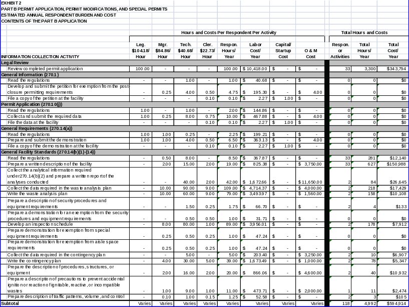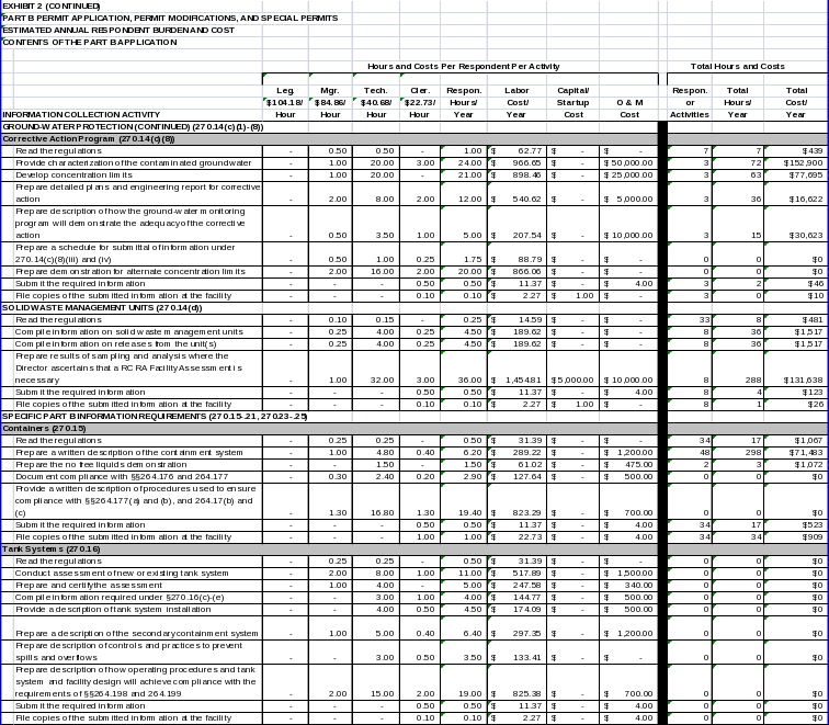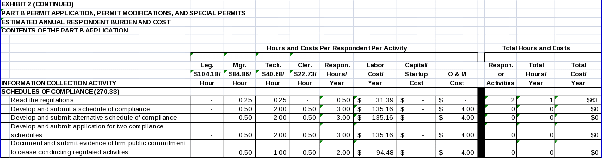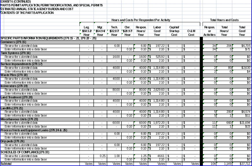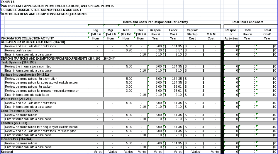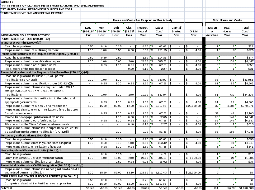 Forty-eight (48) States are authorized for the Part B permit program. The two States that are not authorized, Alaska and Iowa, have not received any Part B permits for the last 15 years. EPA estimates the State Agency hour and cost burden associated with all information collection requirements covered in this ICR in Exhibit 3. As shown in the exhibit, EPA estimates an average hourly labor cost of $58.52 for legal staff, $54.94 for managerial staff, $32.87 for technical staff, and $20.97 for clerical staff.