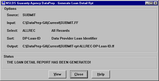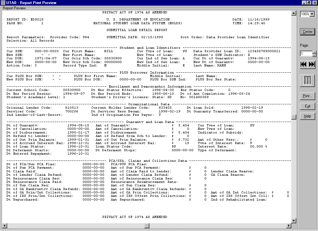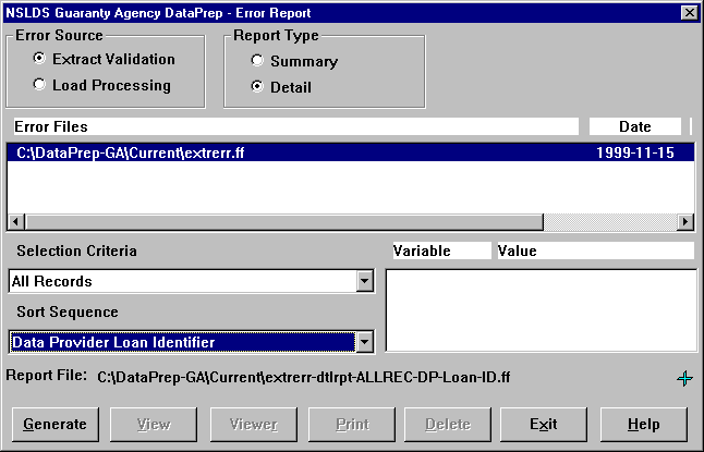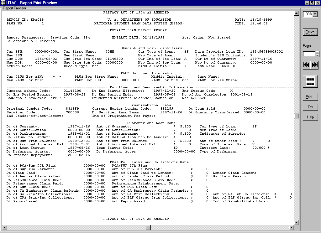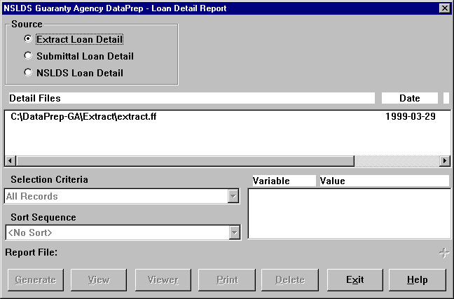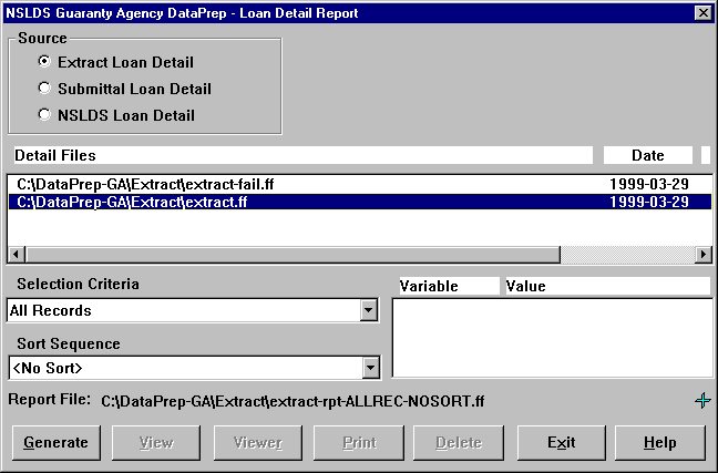 The Extract Loan Detail report, Submittal Loan Detail report, and NSLDS Loan Detail report list in a readable format the value for every field of every record they contain. In the case of the Extract Loan Detail report, the records are those contained in your own database. In the case of the Submittal Loan Detail report, the records are those in your Submittal file. In the case of the NSLDS Loan Detail report, the records are contained in the NSLDS database. Together, these reports are useful for researching discrepancies between the data on your database and the data on the NSLDS database.