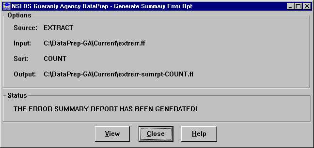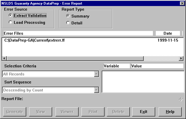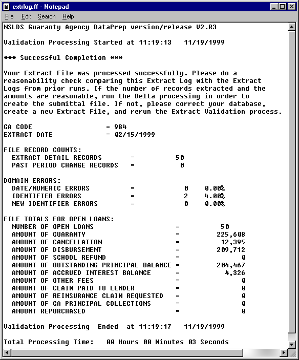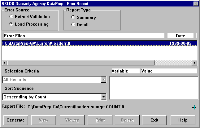 There is one significant difference between the two summary error reports. The Summary Extract Error report summarizes only the domain-level errors in your Database Extract file, while the Summary Load Process Error report summarizes all the domain-, record-, and load-level errors in your Database Extract file. Thus, the Summary Load Process Error report offers a fuller picture of the types of errors that occur in your Submittal file. However, the Summary Extract Error report identifies domain-level errors earlier in the NSLDS update process, and it is invaluable if you need to lower your rate of domain-level errors beneath the ED-established threshold levels in order to create a Submittal file at all.