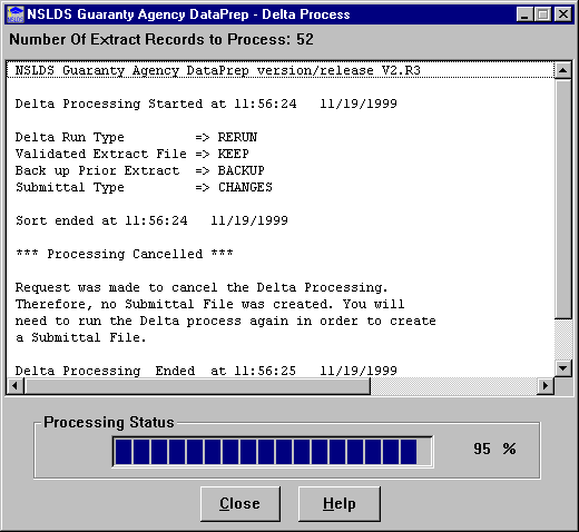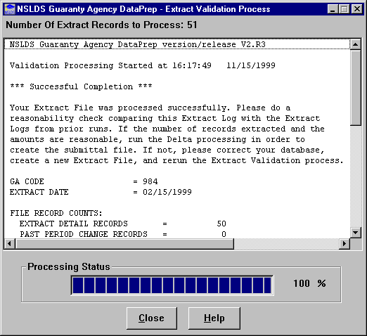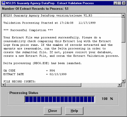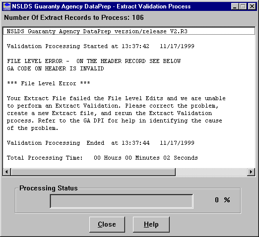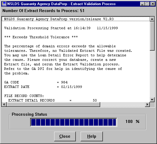 If the rate of domain-level errors in your Database Extract file exceeds the threshold levels established by ED, DataPrep will not create a Submittal file. However, it will create an Extract Error file that you can use to create Extract Error reports and correct your database before creating a new Database Extract file and rerunning Extract Validation. Even if your domain error rates are below the thresholds, you can still create Extract Error reports and get a head start on correcting any domain-level errors Extract Validation does identify in your Submittal file.