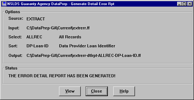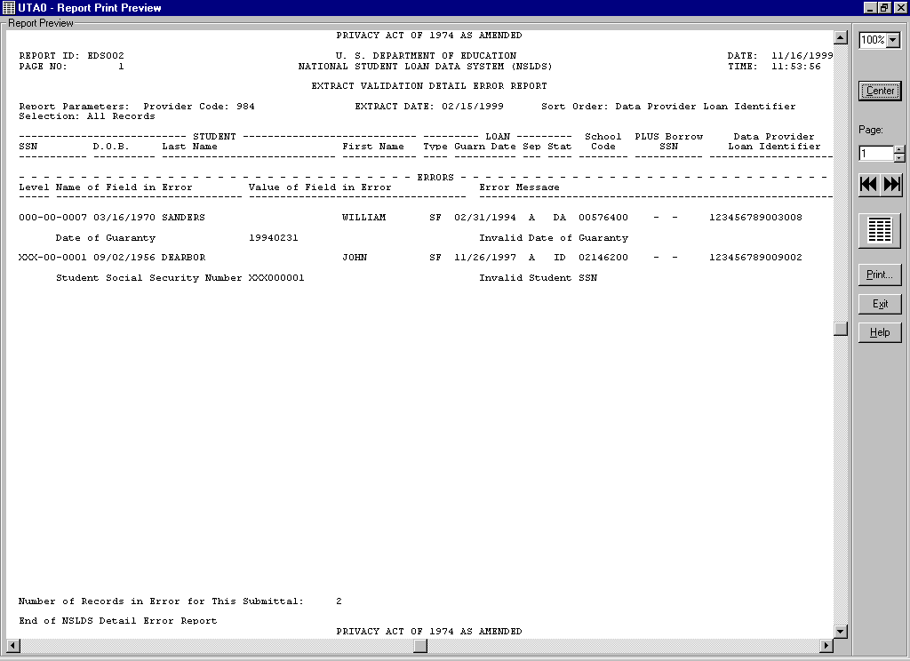 There is one significant difference between the two detail error reports. The Detail Extract Error report contains all the domain-level errors in your Submittal file, while the Detail Load Process Error report contains all the domain-, record-, and load-level errors in your Submittal file. Thus, the Detail Load Process Error report offers a fuller picture of the types of errors that occur in your Submittal file. However, the Detail Extract Error report identifies domain-level errors earlier in the NSLDS update process, and it is invaluable if you need to lower your rate of domain-level errors beneath the ED-established threshold levels in order to create a Submittal file at all.