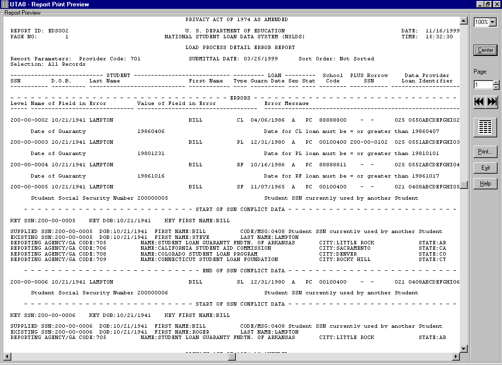For example, the Load Process Error report might contain a record with the typographical error 20960125 (January 25, 2096) in the Date of Guaranty field instead of the correct 19960125 (January 25, 1996). NSLDS would reject this date as being in the future. In your next Submittal file, you must resubmit the record that contained the error with a valid Date of Guaranty.