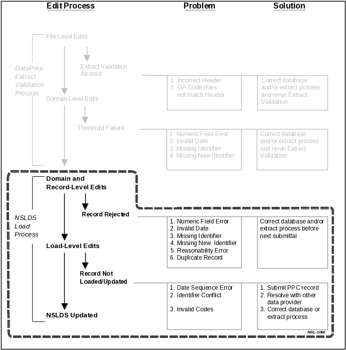 While Extract Validation will process records with domain-level errors as long as your domain error rates remain below the threshold levels, the Load Process will not load such records onto NSLDS. Instead, it will write them to the Load Process Error report, which you should use to correct your database or extract procedure.
