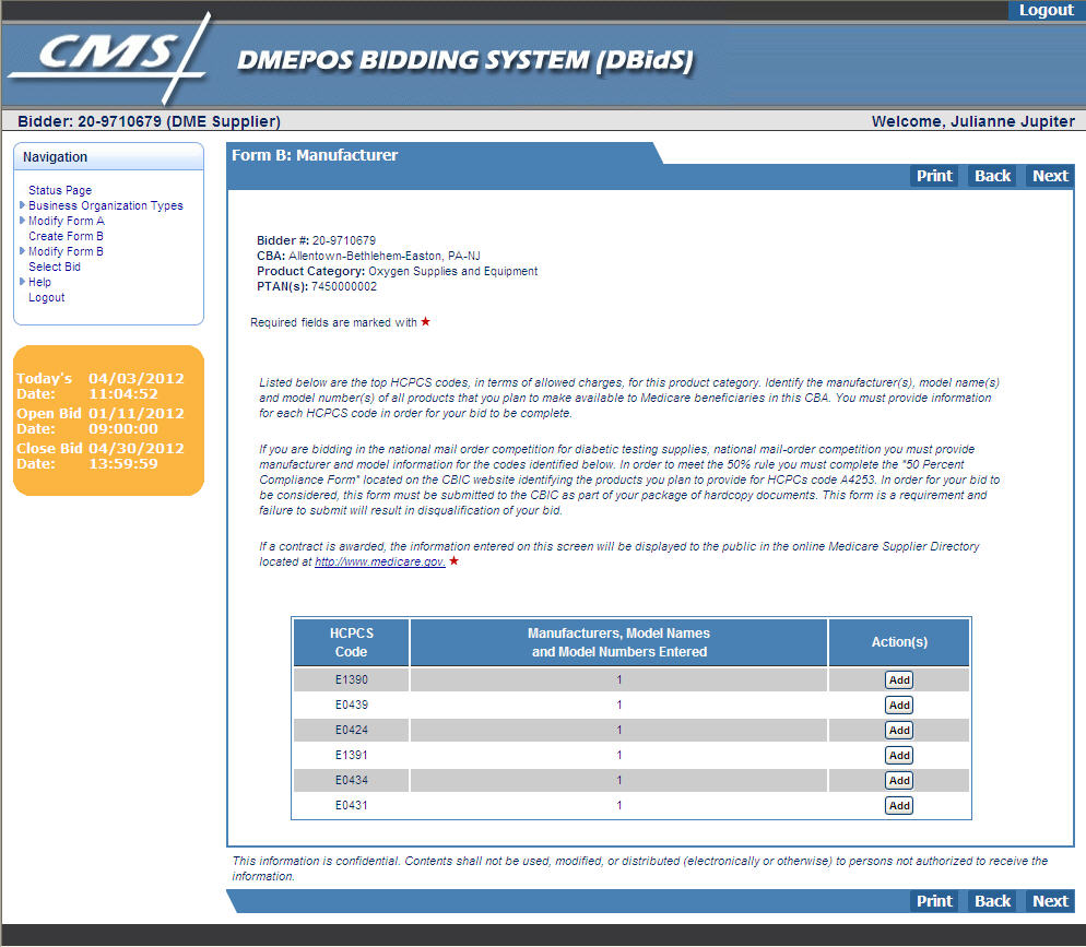 Requests for Bids (RFB) for Durable Medical Equipment, Prosthetics, Orthotics, and Supplies (DMEPOS) Competitive Bidding Program