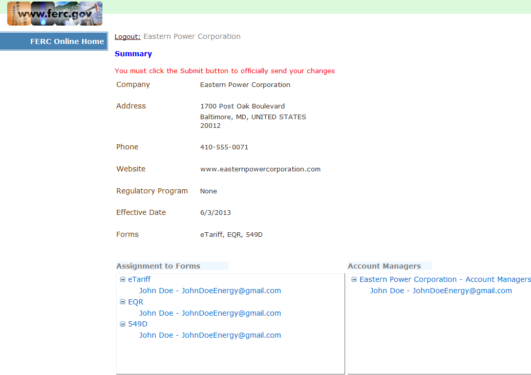 This email was sent to inform you of activity in the Company Registration account of [Company Name], in the Federal Energy Regulatory Commission’s (FERC) Company Registration system. To view the status of the account and confirm the account activity, please log into the Company Registration system, located at http://www.ferc.gov/docs-filing/company-reg.asp. Thank you for participating in the FERC Electronic Filing System. If you have any questions, please contact FERC at: E-mail: efiling@ferc.gov (do not send filings to this address) Voice Mail: 202-502-8258. |