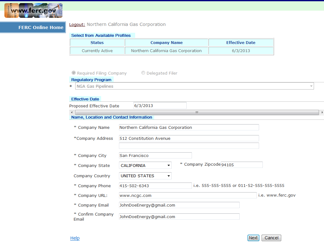 If the last Company Profile is a Pending request to change the Company Profile, that data will appear. Pending can mean either pending acceptance by the Commission, or the Effective Date is in the future. Only one Pending request for a modification of a Company Profile can exist at a time. Any changes of the Pending Company Profile will over-ride the original Pending request.