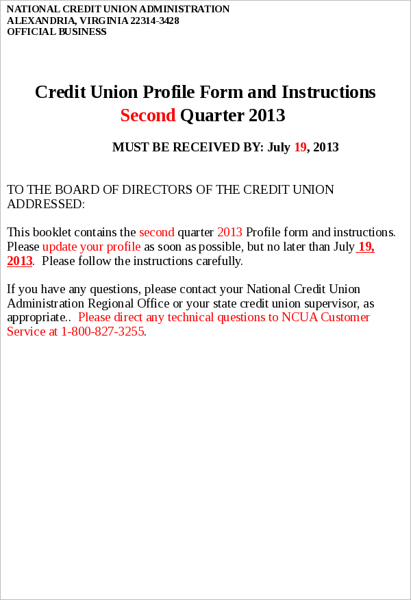 | Providing Updated Information: In accordance with NCUA Rules and Regulations Part 741, credit unions are required to update their profile information within 10 days of the election or appointment of senior management and volunteer officials, or within 30 days of any change. Online filing credit unions will make these changes in the online system. Manual filing credit unions will update their information on this paper form and send it to their regulator. |