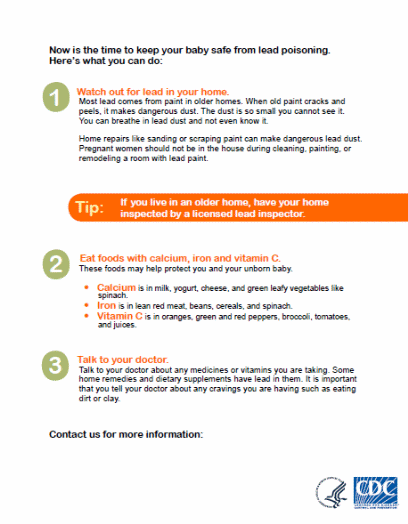ATSDR plans to use the CDC lead program’s factsheet “Are You Pregnant,” available here: http://www.cdc.gov/nceh/lead/tools/Are_You_Pregnant.pdf.