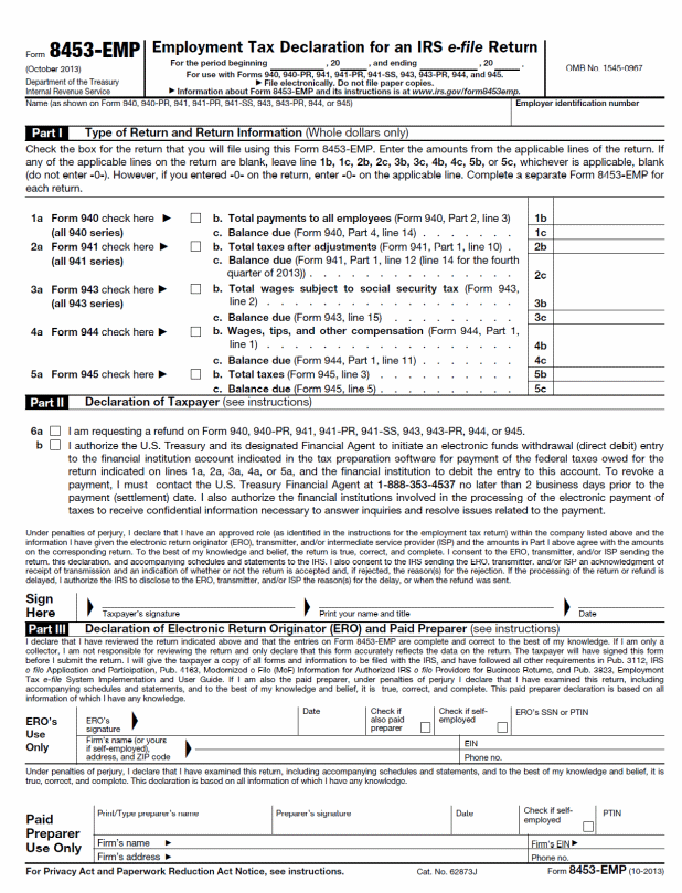 The IRS recently introduced two new methods of electronically signing e-filed employment tax returns, using Forms 8879-EMP and 8453-EMP. With the 8879-EMP, the employer signs a form authorizing the return originator to transmit a PIN to the IRS in place of a signature, and the originator retains the signed paper form. With the 8453-EMP the employer signs a paper form which is then scanned, and a PDF signature document is transmitted as an attachment to the e‑filed return. (Provide copies of the Forms 8879-EMP and 8453-EMP)