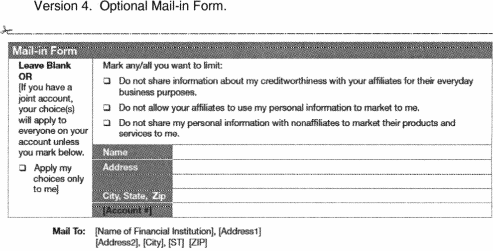 (g) Mail-in opt-out form. Financial institutions must include this mail-in form only if they state in the “To limit our sharing” box that consumers can opt out by mail. The mail-in form must provide opt-out options that correspond accurately to the “Yes” responses in the third column in the disclosure table. Institutions that require customers to provide only name and address may omit the section identified as “[account #].” Institutions that require additional or different information, such as a random opt-out number or a truncated account number, to implement an opt-out election should modify the “[account #]” reference accordingly. This includes institutions that require customers with multiple accounts to identify each account to which the opt-out should apply. An institution must enter its opt-out mailing address: in the far right of this form (see version 3); or below the form (see version 4). The reverse side of the mail-in opt-out form must not include any content of the model form.