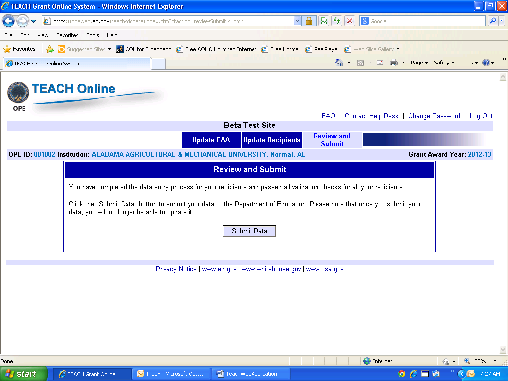 If there are no errors, a Submit button displays. The user can click this button to submit their report. When the report is submitted, a verification email will be sent to the FAA and the data entry person. All recipient records on the tblTempStudent table will be copied to the tblRecipient table.