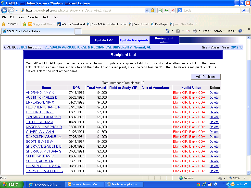 The Table View screen lists all the recipients for the institution with the Field of Study and Cost of Attendance entered on either the spreadsheet or the Web page. The total number of recipients displays. The recipient last name has a link to the update screen. The Invalid Format/Value Error column lists any fields that have errors in the format or value. The Data Validation Error column lists any fields that did not pass the cross-check validations. The Record Number column displays the record numbers from the spreadsheet uploaded, if any. The user must correct all the data errors displayed in the table before proceeding to the Review and Submit page to submit recipient data. The Table View page is sorted by data validation error, so all recipient records containing errors will be listed first. Users are able to sort by columns by clicking the link on the field headings.