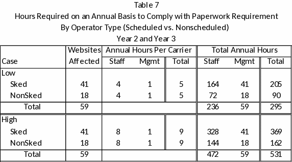 In the low case, it is assumed that 5 hours per Web site are required on an annual basis to comply with the paperwork burden. The 5 hours consists of 4 staff hours and 1 management hour. In the high case, an annual total of nine hours (8 staff hours plus 1 management hour) per carrier is required for the paperwork burden. Summed across all carriers, a total of 295 hours in the low case and 531 hours in the high case will be required to comply with paperwork burden.