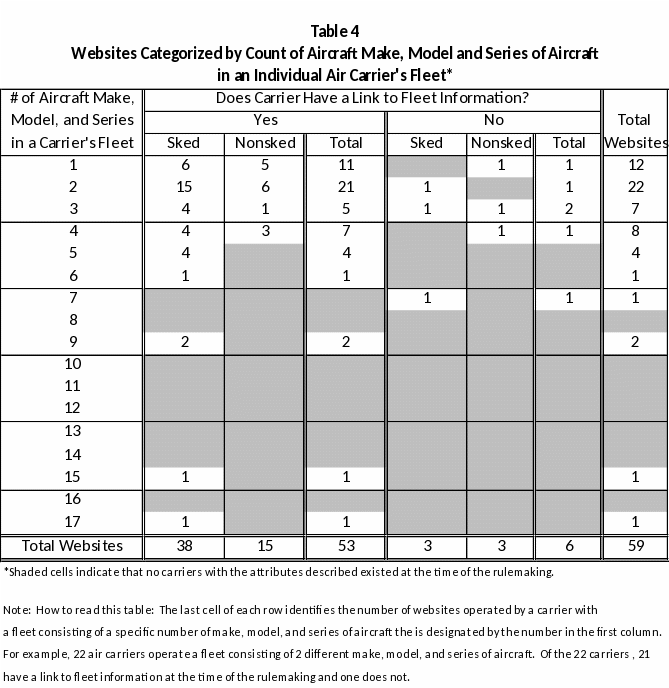 For illustrative purposes, the computation of the paperwork hour burden for a single carrier is provided using the following assumptions from the low case: 1) the carrier had a Web link to fleet information at the time of the rule’s implementation, and 2) the carrier has a fleet of seven different make, model, and series of aircraft (Table 3, column 1). Looking at Table 2, a carrier with these attributes requires 13.5 hours to comply with the rule in Year 1. The equation used to calculate the 13.5 labor hours is below: