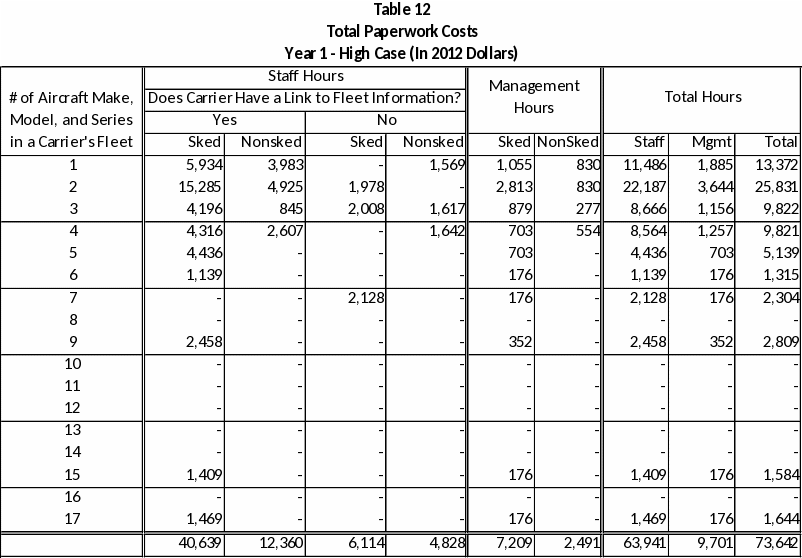 Table 2: Table 2 shows the low case estimate for paperwork burden hours based on the each carrier’s count of make, model, and series of aircraft in its fleet. The estimate is derived using an individual carrier’s attributes as described in Table 1. Table 2 provides the paperwork hour burden for a carrier with a count of up to 17 make, model, and series of aircraft (the most of any carrier at the time of this rulemaking).