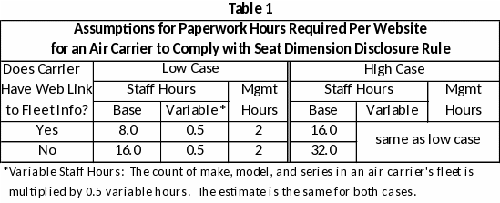 Table 1: This table shows the assumptions for staff and management hours that are used to calculate total labor hours required for an individual air carrier to comply with the seat dimension disclosure rule. (Again, the labor hours required to bring an air carrier’s Web site into compliance is equal to the paperwork hour burden). Assumptions for estimating labor hours are provided for both the low and high case.