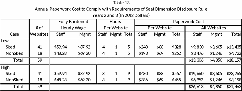 This rule requires Part 121 passenger air carriers to post seat dimension information to their Web sites. The labor required to comply with this rule is for the collection of information. Thus the labor hours estimated for the regulatory evaluation is the paperwork hour burden. To estimate labor hours, the FAA used assumptions for job skills and labor hours from the regulatory analysis1 of the Department of Transportation’s (DOT’s) recent “Enhancing Airline Passenger Protections”2 rule. One provision of the DOT’s rule required an air carrier to post on its Web site a tarmac delay plan and a customer commitment plan, and the FAA believes that the skills and labor hours estimated for this task are similar to those required to post information about seat dimensions. In the DOT rule, it was estimated that it would take a computer programmer and a supervisor/manager a combined total of eight hours to post the customer commitment plan and tarmac delay plan to an air carrier’s Web site. The FAA is using the DOT estimate of eight hours as the foundation for the time required to perform the work required to comply with the seat dimension disclosure rule.
