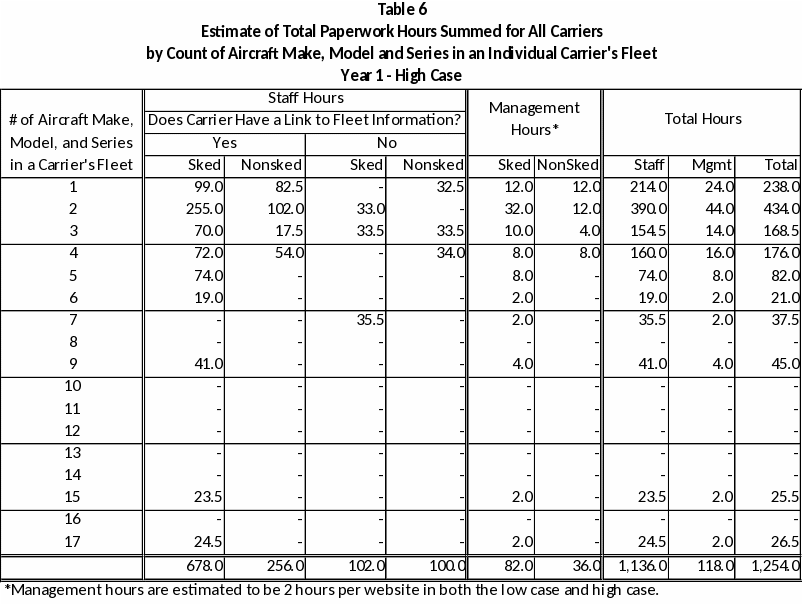 For illustrative purposes the derivation of total labor hours reported in row 3 of Table 5 (96.5 hours) is provided. This row contains the total paperwork burden hours computed for the seven carriers (See Table 4, Line 3) that operate a fleet of three different make, model, and series of aircraft. Of the seven Web sites five already have a link to fleet information and two do not. The following is the calculation of staff and management hours.