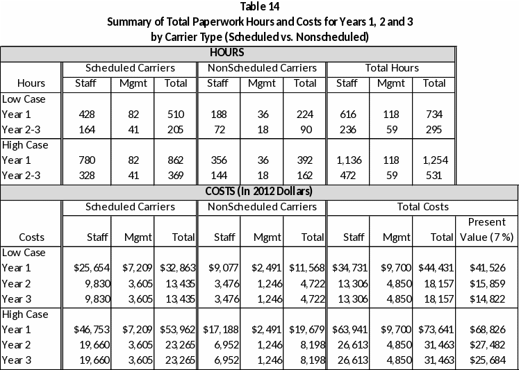 Table 14 summarizes paperwork burden hours and costs for the low and high cases during the first three years of the rule’s implementation.
