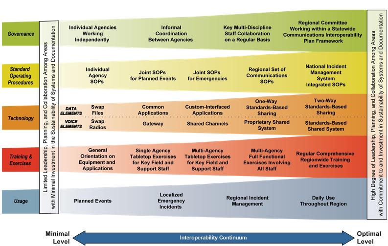 The Interoperability Continuum, developed by SAFECOM and shown in Figure 3, serves as a framework to address all of these challenges and continue improving operable/interoperable and emergency communications. It is designed to assist emergency response agencies and policy makers with planning and implementing interoperability solutions for voice and data communications.